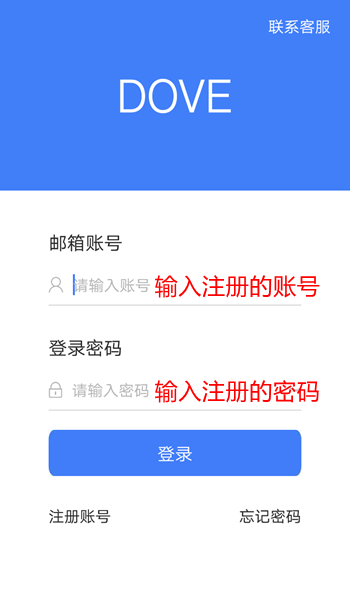 第2步:运行APP后,输入:您注册的DOVE邮箱账号和密码,点击 - 登录(如图)