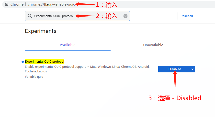 第1步:QUIC 协议是 Chrome 默认开启的实验性协议,会导致DOVE无法访问的情况,禁用此协议保证使用效果: