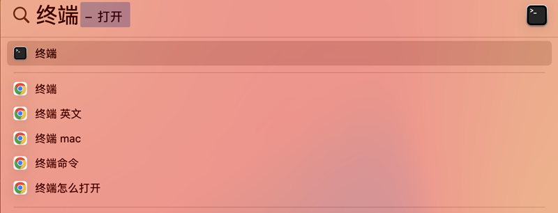 第1步:同时按下Command(⌘)+ 空格键,打开搜索框输入并运行 - 终端