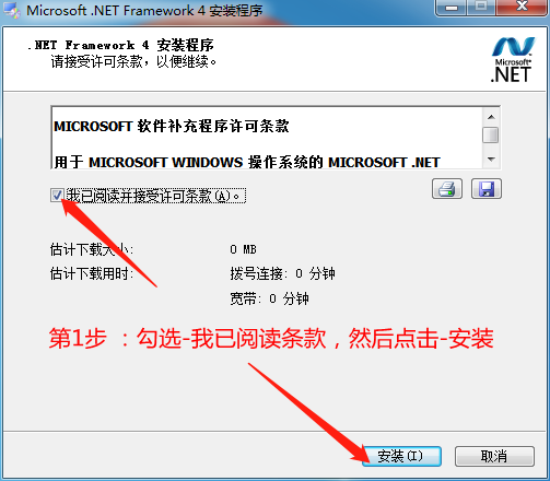 第1步:勾选 - 我已阅读并接受许可条款然后点击 - 安装